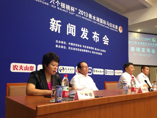 (李春彦 乔军报道)8月7日下午,2013衡水湖国际马拉松赛新闻发布会在国务院新闻发布厅举行。中国田径协会副主席、国家体育总局田径运动管理中心副主任王大卫,河北省体育局巡视员杨静之出席新闻发布会;衡水市市长杨慧在发布会上致辞;发布会由衡水市委常委、宣传部长王金刚主持,衡水市副市长杨新丽对2013衡水湖国际马拉松赛赛事情况进行新闻发布。