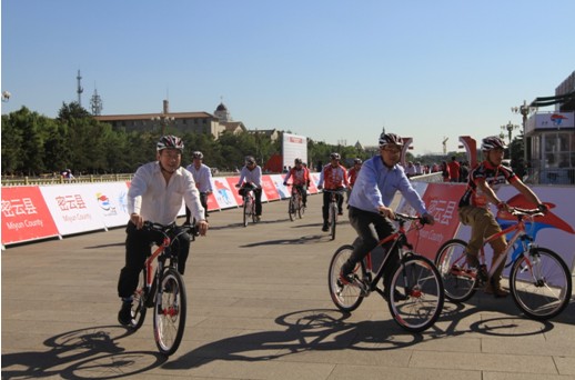 北京市政府副秘书长侯玉兰(右一)、北京市体育局局长李颖川(右二)、北京市体育局副局长李晋康(左一)、北汽集团副总经理张健(左二)、北汽股份有限公司副总裁梁国锋(左三)参加了绅宝赛段荣誉骑行