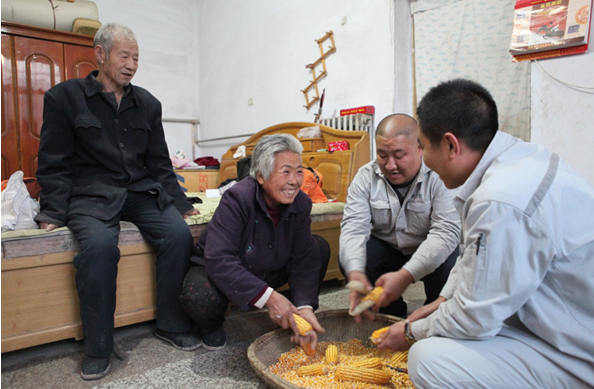 (图为侯建良和徐晓东在为两位老人脱玉米粒)