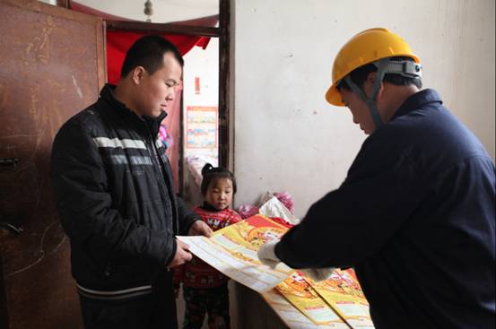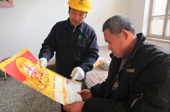 这是腊月三十的上午,老于在为辖区汉留各庄村的百姓们发放宣传页。今年,老于从一进腊月就将辖区三个村子的线路、变压器等设备进行了维修,并三天两头的巡视一遍,这不,从二十八开始,老于便开始发放宣传页,一来是挨家走走,了解一下各个用户的用民需求,是否发生了变化;二来再给人们讲讲用电知识,确保春节期间用户的用电安全;三来,就是给大家拜个早年,感谢一下大家对他一年来工作的支持。