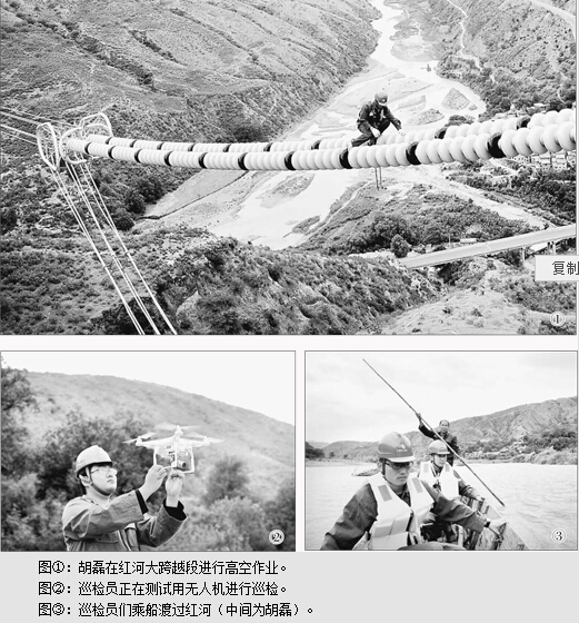 等巡检员们到达谷底后,当地的摆渡人早已在红河岸边等候,将这些电力小伙子们送到对岸。红河在汛期宽达100—120米,沿线并没有供人通过的桥梁,摆渡是他们跨河的唯一方式。这次巡检,胡磊还带上了无人机进行巡检测试。“我们将来会用无人机对这段线路进行空中特巡,省时省力,还能检测到很多人力无法巡检的地方。”胡磊说。