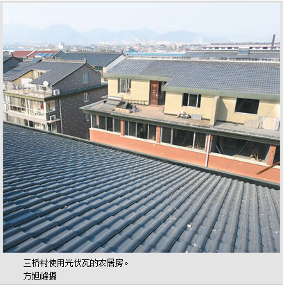 黄公望村是富阳光伏发电的又一个示范村,同时也是目前富阳最大的一个“光伏发电试验村”,站在黄公望村村口,远远望去,屋顶上铺的瓦片在太阳底下熠熠生辉。从2014年起,村里统一在289户新建民居点安装“会发电”的光伏瓦片,每户采用100块20瓦/块的平板型光伏陶瓷瓦片,单户装机容量达2000瓦。
