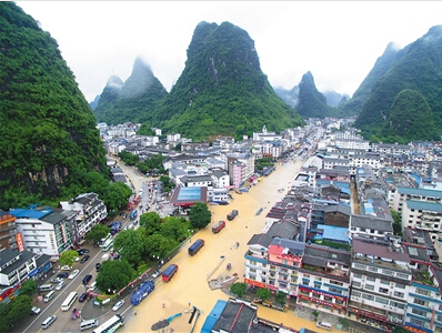 受连日强降雨影响,截至5月8日17时,广西桂林阳朔县多地被淹。由于严重内涝,目前县城仍在大面积停电之中。