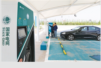 图为在张承高速张家口服务区充电站,一名驾驶员准备为自己的电动汽车充电。