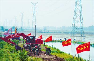 6月26日上午,武警水电五支队官兵顶着烈日,配合江苏盐城供电公司电力抢修人员,在施庄镇桃源村抢修铁塔、清除树障、修筑道路,助力灾后恢复重建。