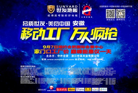 想购买世友地板的消费者朋友,请一定不要错过这次购物良机。9月7日,安徽国际会展中心(2号馆),世友地板与您不见不散。详情请垂询世友地板各专卖店或关注世友地板官方网站及官方微博、微信及时了解动态。预约热线:400-888-3898(总部报名直通车) 0515 65168288(安徽报名直通车)