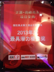 凭借去年良好的市场表现,今年5月18日,在北京、上海两大城市,由中国指数研究院、中国房地产指数系统联合主办,搜房网联合承办的2013第八届中国商业地产年会上,“正源?北京?尚峰尚水”荣获“2013中国投资潜力楼盘”!