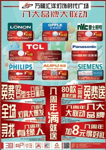 12月8日,为了庆祝万隆汇洋灯具灯饰广场八周年庆典,飞利浦、欧普、奥普、TCL、雷士、松下、朗能、西门子等八大国内、外一线品牌将携手让利,倾情回馈消费者。活动当天,八大品牌将限量推出1-99元不等的特价灯,限量销售,如奥普原价399元的浴霸灯,仅售99元;TCL原价85元的21W方形厨卫灯,仅售9·9元,欧普原价178元的40W吸顶灯仅售29.9元,飞利浦5W节能灯更是爆出了1元一只的跳楼价!