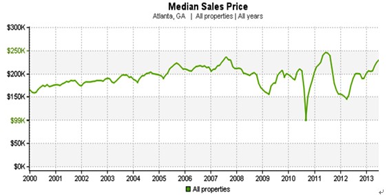 亚特兰大房屋中价位2013年10月至12月为$190,000,比起前一季度上升11.1%,比起2012年同期增长15%。