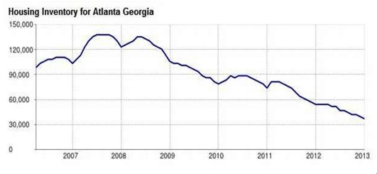 截止2013年一月,亚特兰大库存水平较2012年下降31.6%,库存水平的下降必定抬高房价。