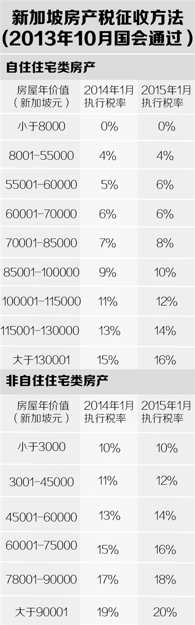例如,从2014年1月起,年值8000新元的自住房屋免收房产税。年值3万新元的屋子若是自住,就是(30000—8000)×4%,每年的房地产税只有880新元,否则,就是30000×10%,每年得支付3000新元。而年值10万新元的房子,若自住,对超过8000新元的部分收9%的房产税,2015年增加到10%;若非自住,则10万×19%,2015年增加到20%。以2015年的标准与原房产税相比,年值1.2万新元的自住房组屋,房产税减少33%,仅160新元,非自住的保持不变;而年值15万新元以上自住有地房产,房产税增加了69%,为12580新元,非自住更高达2.4万新元,增加了60%。(见自住和非自住房产税率表。本报记者 施晓慧整理)
