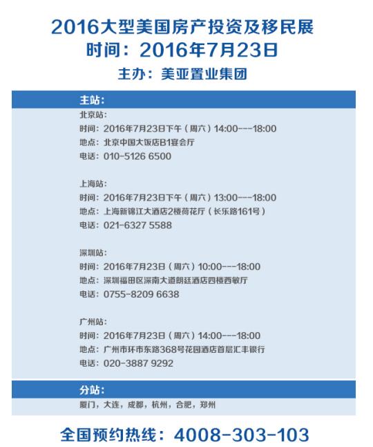 7月23日,由美亚置业集团主办的2016首届大型“美国房产投资及移民展”将在北京、上海、广州、深圳、成都、大连、杭州、厦门、郑州、合肥等十城同时火热召开。本次美国房产主题展不仅推出多个精品房源,还将推出美国EB5移民项目,50万美金让您轻松移民美国!
