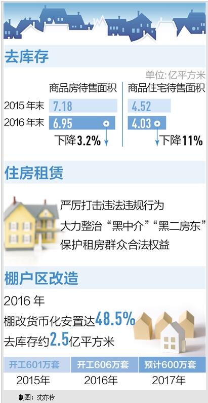 棚户区改造是重大的民生工程。2015年、2016年,全国棚改分别开工了601万套、606万套,今年的计划目标是600万套。陈政高介绍,今年中央棚改补助资金已经有了安排,比去年有所提高,“今年还要进一步推进棚改货币化安置,特别是在三四线城市和县城,要大幅度提高比例,加快棚改进度、减少重复建设。”