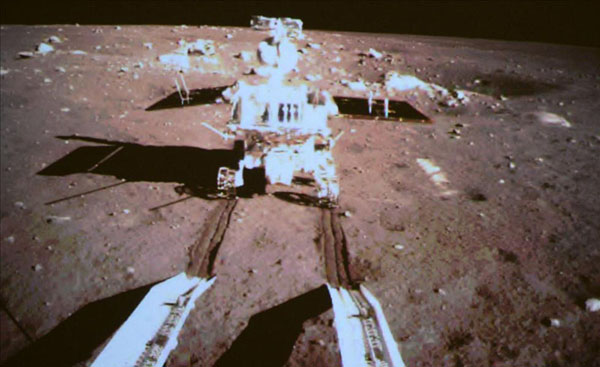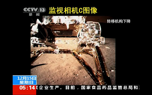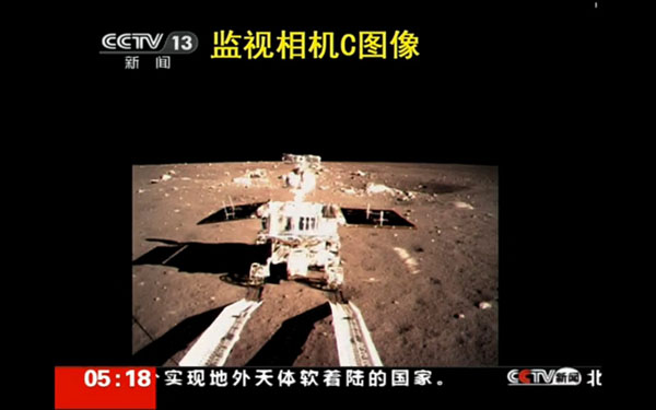 记者在北京航天飞行控制中心飞控大厅屏幕上看到,嫦娥三号着陆器安然立在月面,太阳翼呈展开状态。“玉兔号”巡视器立于着陆器顶部,展开太阳翼,伸出桅杆。