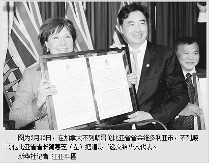 本报渥太华5月16日电 (记者李学江)15日,加拿大不列颠哥伦比亚省议会通过一份决议,就该省在历史上歧视华人一事向华人正式道歉。