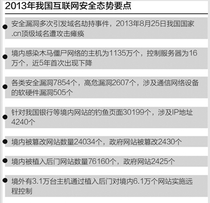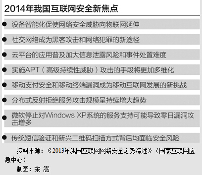 大数据、云计算也是网络安全防御的新重点。伴随移动互联网等的发展,大数据近年受到越来越多关注。据BBC公司统计,2013年全球互联网流量每天为2.7EB,全球新产生的数据年增40%,每两年就可以翻番。大数据的挖掘可应用到经济、政治、国防、文化等各领域。大数据是信息化新阶段的特征,也是网络安全防御的新重点。我国对大数据的存储、保护和利用重视不够,导致信息丢失或不完整,同时存在信息被损坏、篡改、泄露等问题,给国家的信息安全和公众的隐私保护带来了隐患。此外,宽带化以及信息化应用的深入推动了云计算发展。个人的云存储、企业的云制造以及云政务等在近年迅速发展。据统计,到2015年全球数据中心的一半都会基于云计算技术。与全球云计算行业的复合年增长率23.5%相比,我国云计算市场增长更快,年增长率超过40%。云计算能力的分布化、虚拟化、服务化是云计算的技术基础,但云计算平台如果被攻击,出现故障,就会导致大规模的服务器瘫痪。