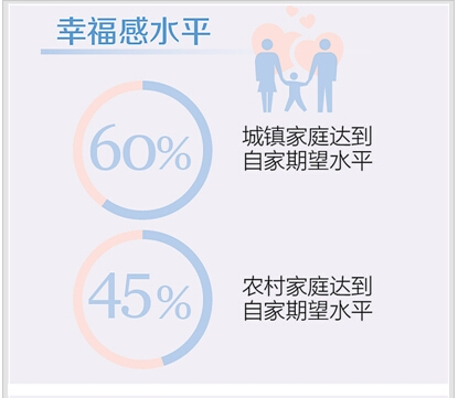 调查发现,城镇家庭幸福感水平总体上高于农村家庭。近60%的城镇家庭幸福感得分达到了自家的期望水平,农村家庭的这一比例是45%。城镇家庭内部关系略好于农村家庭。