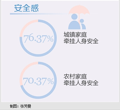 城镇家庭的安全感明显不如农村家庭。不同程度牵挂人身安全的城镇家庭约占76.37%,农村家庭为70.37%;牵挂财产安全的城镇家庭约占66.43%,农村家庭为60.19%。