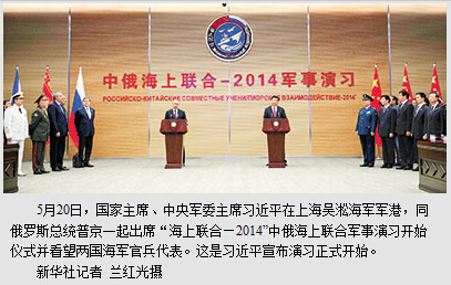 经两国元首批准,“海上联合—2014”中俄海上联合军事演习于5月20日至26日在中国东海北部海空举行。演习以海上联合行动为课题,主要演练联合防空、联合反潜、联合对海突击、实际使用武器等战术科目,提高两国海军共同应对海上安全威胁的能力。