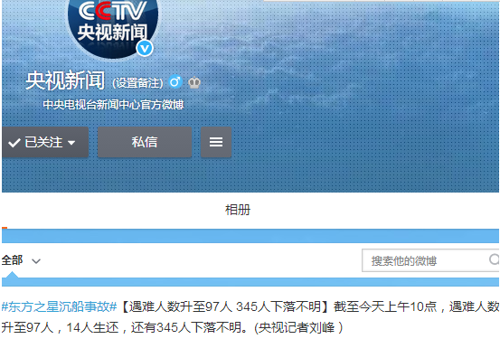 人民网北京6月5日电 据中央电视台新闻中心官方微博消息,截至今天上午10点,东方之星沉船事故中遇难人数升至97人,14人生还,还有345人下落不明。