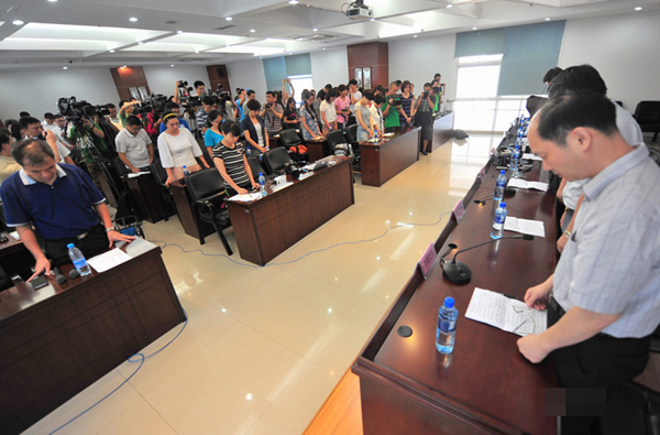 6月8日,在厦门市人民政府新闻发布会现场,厦门市安监局、交通局、卫生局、教育局的相关负责人、新闻发言人和媒体记者向遇难者默哀。新华社记者魏培全摄