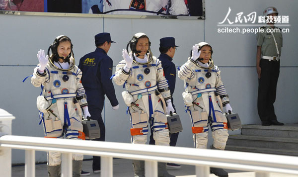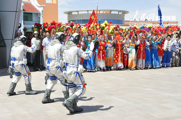 神舟十号三名航天员向送行的群众挥手致意。(人民网记者 魏艳摄)