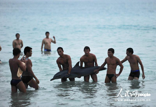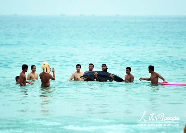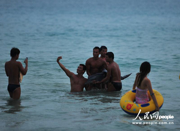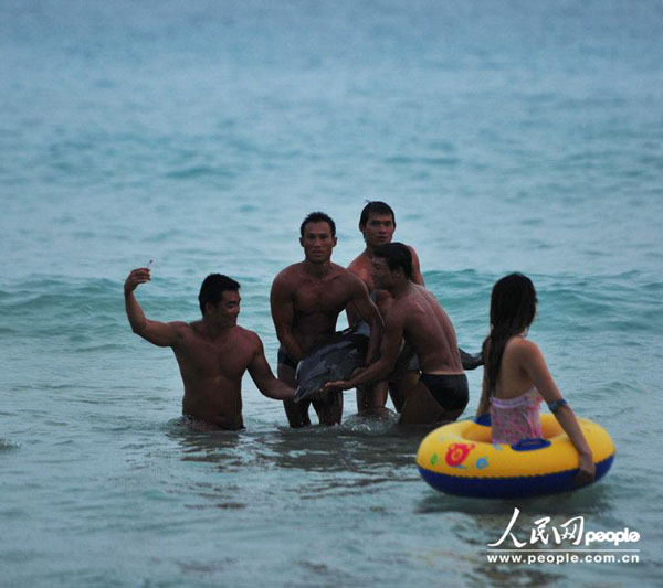 2013年6月16日下午6时许,有市民在海南省三亚市大东海海域上发现一头搁浅的海豚,随后拨打相关部门的电话求助。而就在等待专业的救援人员到达的过程中,一些正在海面上游泳的游客和市民闻讯而来,纷纷拿出手机拍摄这头受伤的海豚,更有甚者,不停地要求救生人员将已经奄奄一息的海豚抬出水面与之合影。对此,一位路过的老渔民称,这些做法非常不妥,海豚很容易呛水而导致死亡。