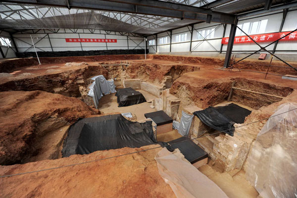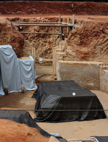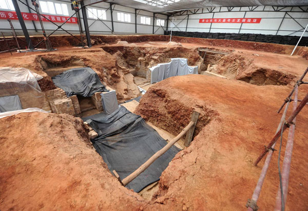 正在进行抢救性考古发掘工作的北京房山区长沟镇唐代大型墓葬(6月17日摄)。