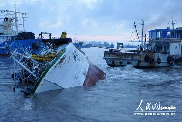 2013年6月19日,浙江温岭,遇险台湾渔船在救援船牵引下进入石塘港。郏策/CFP