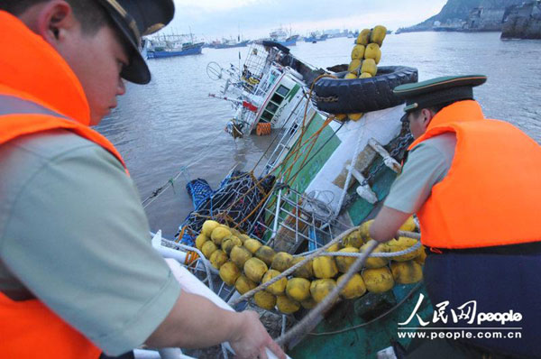 2013年6月19日,浙江温岭,边防民警正在加固遇险台湾渔船锚泊缆绳。郏策/CFP