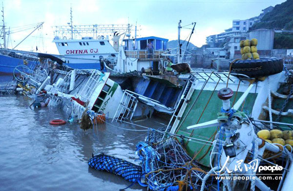 2013年6月19日,浙江温岭,遇险台湾渔船停泊在石塘港内等待修理。郏策/CFP