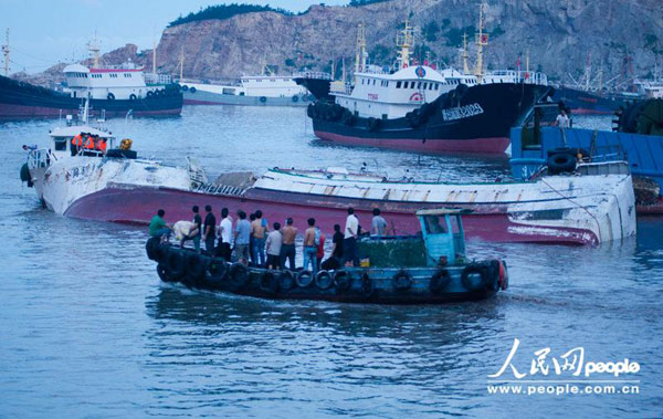 2013年6月19日18时许,台湾渔船“金同福16号”在救援船牵引下缓缓进入浙江温岭市石塘港。朱海伟/CFP