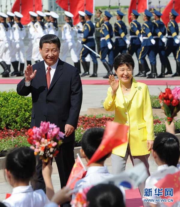 会谈前,习近平在人民大会堂东门外广场为朴槿惠访华举行欢迎仪式。新华社记者 姚大伟 摄