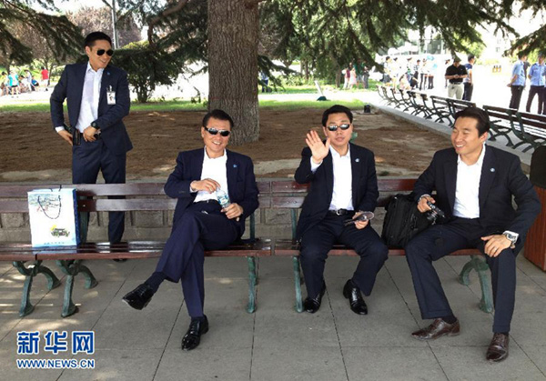 6月30日,在秦始皇帝陵博物院,韩方安保人员在朴槿惠到来之前,在长凳上休息。
