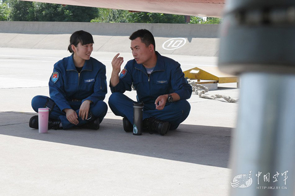 初教机毕业以后,在停飞的2个月内,梁潇体能锻炼相对较少,体能下降比较快。为尽快帮她补上体能,尽快适应高教机飞行训练节奏,每次体能训练结束后,我总会主动留下来陪她跑步练体能,风雨无阻,从不间断。朱琳现在忆起帮助梁潇的事,脸上还露出丝丝甜蜜。图为面对面传帮带(林源 摄)