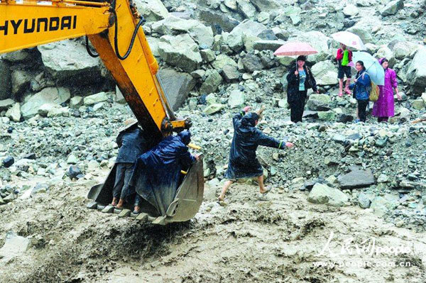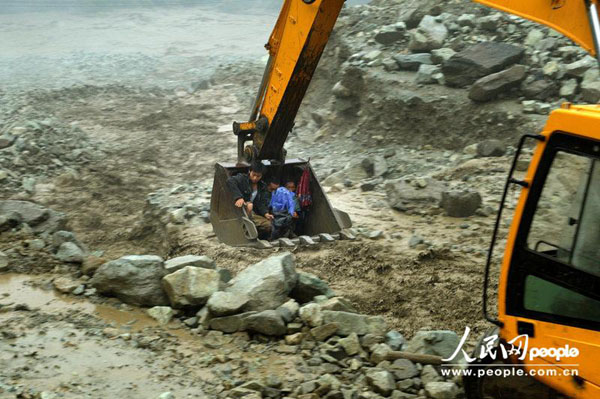 周军一边用挖掘机的机械臂推开眼前的巨石,一边向山上艰难爬行。终于赶在昨天上午10点左右冲到了接人的地点。周军启动操纵杆,将挖掘机的翻斗伸到断路处的对岸,等候的村民2人一组,逐一坐上翻斗,前往安全地带。3小时后,200多名群众被救出。此时,周军已经来回旋转驾驶室上百次。