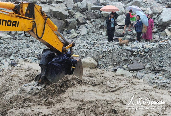 因为泥石流不断倾泻,断路处被巨石和淤泥堆成了一个45度的乱石坡,随时可能垮塌。挖掘机要先爬坡才能到达接人的地点,每隔几分钟,几十吨重的巨石就会与洪水一同倾泻而下。