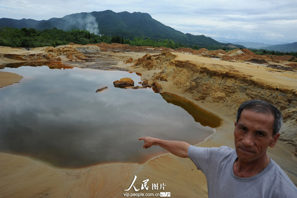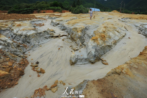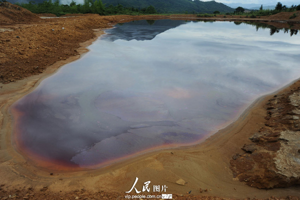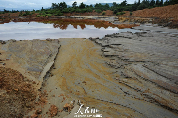 选矿场面积有50多亩,是由良田、山地及水库组成。选矿场原先用的都是土法选矿,大量有毒元素及重金属渗透到土壤之中。7月16日记者来到选矿场,迎面扑来的气味十分刺鼻,三个小水塘里面的水变成暗红色,许多地方已变成盐碱地,到处都是沟壑纵横。村民告诉记者,每到雨天,雨水冲刷流经的地方,草木枯死,河中所有鱼虾全部死光。冲刷的雨水最后流入到信江直到鄱阳湖,影响了沿岸数百万居民饮用水。因为该企业是湖坊招商引资项目,湖坊镇领导从2012年开始答应找选矿场的老板来处理此事,至记者7月16日发稿时止,湖坊镇没有任何作为。专家认为,要消除这块地的污染影响估计要100余年。(艾世民 刘力溱/人民图片)