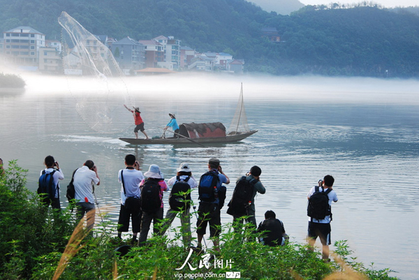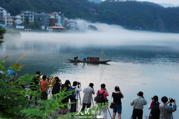 2013年7月20日清晨,在浙江省建德市新安江畔下涯湿地,奇雾缭绕,此起彼伏,舟行其中,时隐时现,宛如仙境,一批来自上海、江苏、杭州、温州等地的200多名摄影爱好者开着驾车,架着“长枪短炮”,不停地按动快门,拍下这一山水如画的美丽景致。