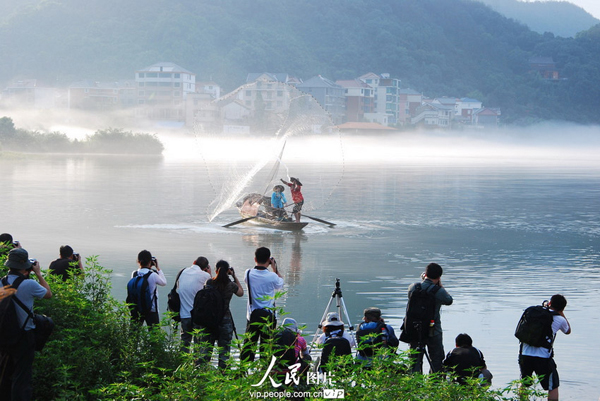 随着下涯湿地生态保护越来越好,每逢盛夏时节,来拍摄湿地飘渺奇雾景致的国内外摄影师越来越多。村里的一些原先以捕鱼为生的渔民也变身“渔夫模特”,每天从凌晨3时左右开始,一直到上7时左右的4个小时间,每人次收取门票30元钱,从6月初一直到9月底的4个月间,“渔夫模特”的生意十分火爆。 宁文武/人民图片