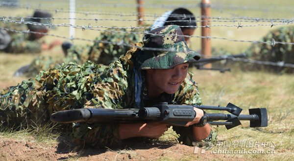 特战队员在精确狙击课目比赛中,参赛队员首先要通过低桩铁丝网进入射击地域。中国军网记者李靖摄
