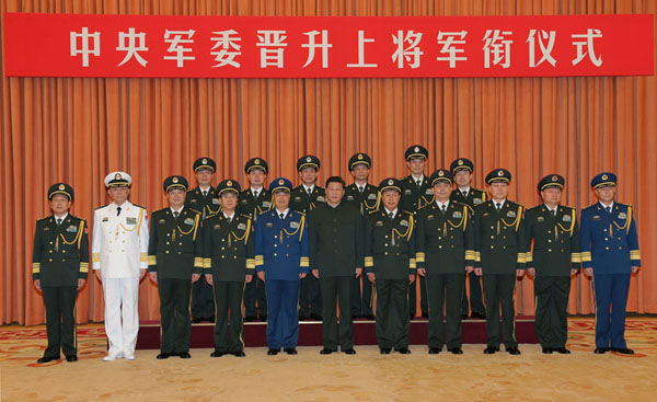 7月31日,中央军委在北京八一大楼隆重举行晋升上将军衔仪式。中央军委主席习近平向晋升上将军衔的同志颁发命令状。这次晋升上将军衔的6位高级军官是:总政治部副主任吴昌德、总装备部政治委员王洪尧、军事科学院政治委员孙思敬、北京军区政治委员刘福连、南京军区司令员蔡英挺、广州军区司令员徐粉林。这是仪式结束后,习近平等领导同志与晋升上将军衔的军官合影留念。新华社记者 李刚 摄