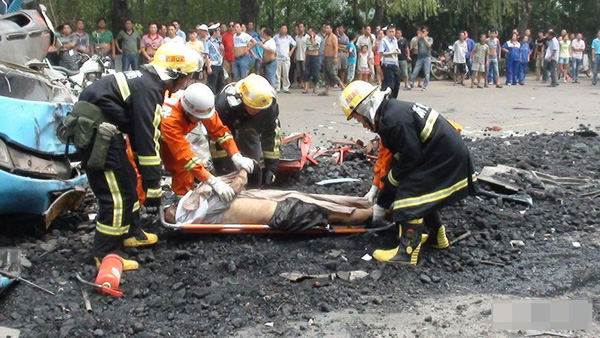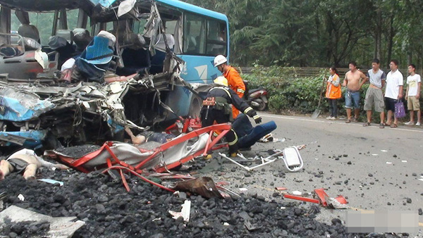 8月2日上午11时许,河南省洛阳市新安县310国道段发生重大交通事故,造成5人死亡惨剧。一部核载33人实载15人的中巴客车与一辆运煤大货车相撞,当场死亡1人,受伤6人,其中4人经抢救无效死亡,其余2人无生命危险。图为事故救援现场。