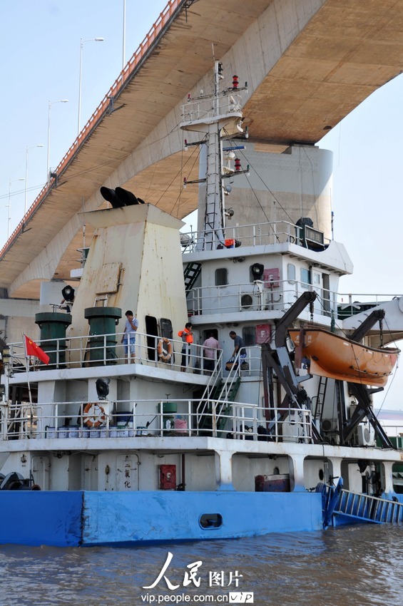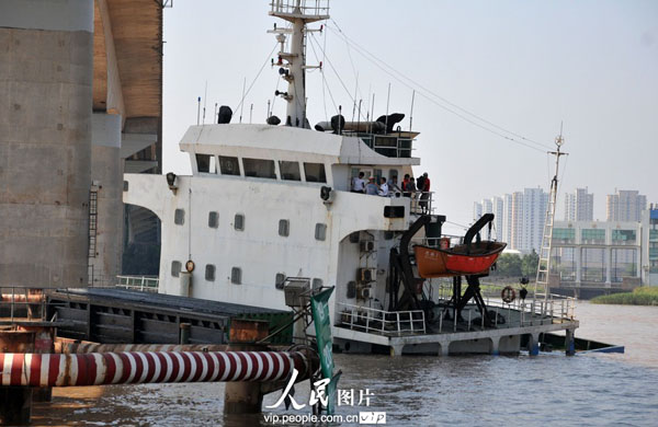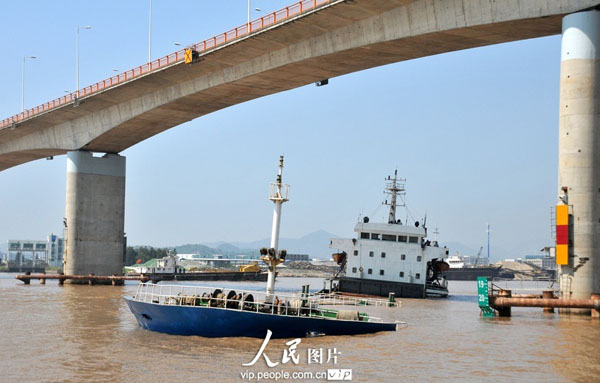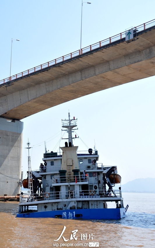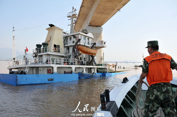 2013年8月6日20时30分许,一艘河北籍满载砂石的5000吨级货船“茂韵1号”撞上浙江省台州市椒江大桥护桥墩,导致货船前舱破损进水沉底。事故发生后,边防、海事等部门立即展开救援,船上13名船员无伤亡。据船长介绍,货船当晚进入海门港准备卸货,航行至距离大桥约400米左右时,舵机突然失灵,导致货船失控发生意外。截止发稿时,事故原因调查和救援工作仍在进行中。郏策/人民图片