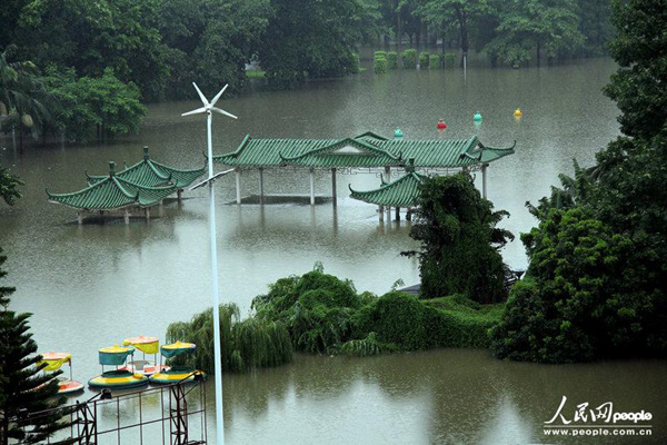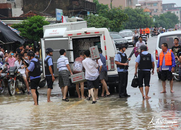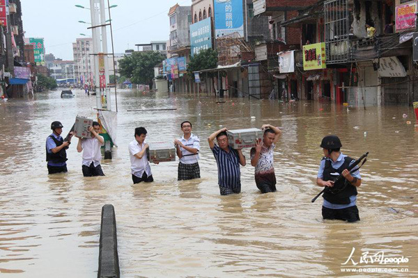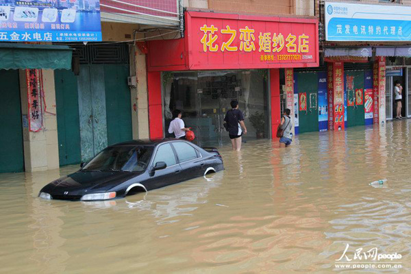 大雨造成茂名市多条江河河水暴涨,市区街道、圩镇、村庄、农田受灾严重,当地政府、三防全力组织抢险救灾,各项救援工作正有序进行。黄信涛/CFP