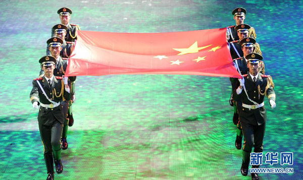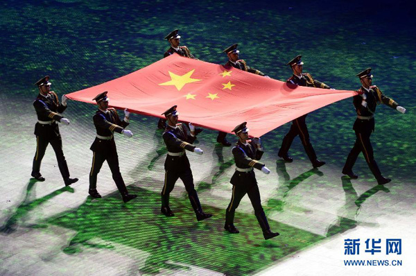 8月16日,中华人民共和国国旗在开幕式上入场。当日,第二届亚洲青年运动会在南京拉开帷幕。 新华社记者刘军喜摄
