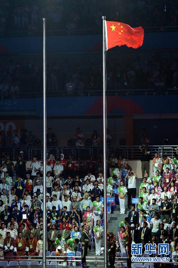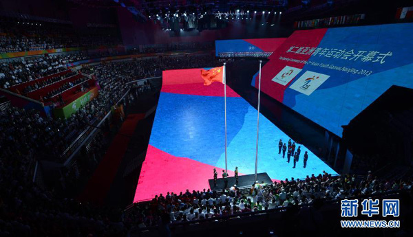 8月16日,中华人民共和国国旗在开幕式上升起。当日,第二届亚洲青年运动会在南京拉开帷幕。 新华社记者蔺以光摄