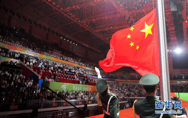 8月16日,中华人民共和国国旗在开幕式上升起。当日,第二届亚洲青年运动会在南京拉开帷幕。 新华社记者鞠焕宗摄