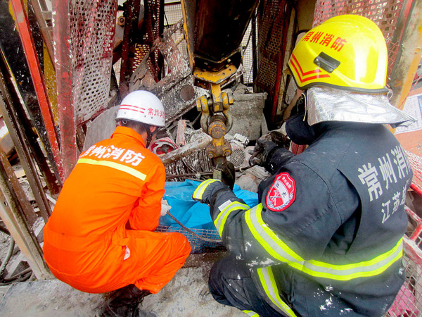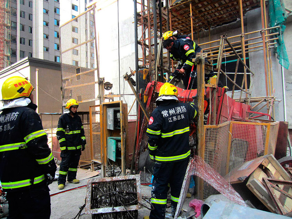 2013年8月16日上午7点左右,武进区横山桥羊绒城旁的东郡花苑建设工地里,一架施工电梯在运行中突然发生坠落,当时共有5名工人在梯笼里。事故中5名工人全部死亡。记者接报赶到现场时,5名工人已被救出工地大门紧闭,所有人都被拦在外面不得进入。透过铁门缝隙看过去,事故现场及周边场地,都用警戒线拦起。公安民警和安监人员等,正在勘查现场。