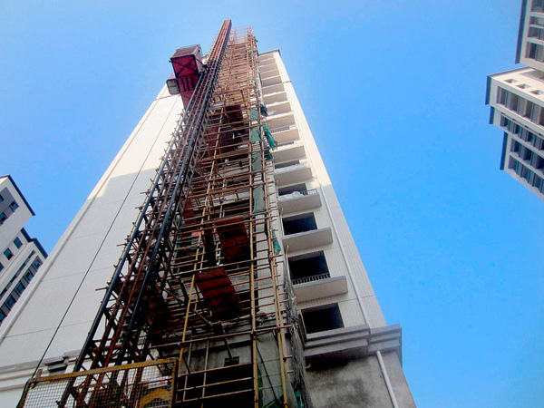 围墙上的工程概况显示,该小区共有1号到13号楼房,分别为11层和18层高。附近一位居民说,小区是去年开始施工的,现在已经接近完工,正在拆除脚手架。有的楼的已经拆完了,有的楼的拆了一半。据了解,事故发生在10号楼,目测有18层高。楼东侧的一台施工电梯坠落后,红色的梯笼已经完全扭曲变形,里面全是石灰等建筑材料,还有一辆小推车停在里面。梯笼里的5人,是两男三女,有内装修工、油漆工,和电梯操作工。一名工人告诉救援人员,当时电梯是往上升的,梯笼里面共有6个人,还有一辆小推车。上到8楼时,其中一人先下来了,随后电梯在继续往上升的时候,突然发生了坠落。记者由此判断,坠落高度应该有20多米。他说,10号楼已经基本完工,施工电梯也要准备拆除了,可能是钢缆断裂使电梯从高层坠落。
